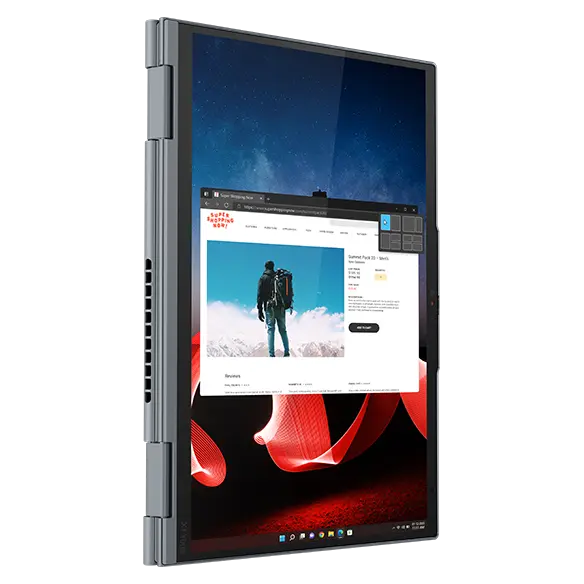 Nhờ bản lề 360 độ, máy tính xách tay 2 trong 1 ThinkPad X1 Yoga Gen 8 có thể nhanh chóng chuyển đổi giữa chế độ máy tính xách tay, máy tính bảng, lều và đứng. Bất kể công việc của bạn đưa bạn đến đâu, chúng tôi đều có cách để phù hợp với phong cách của bạn và giúp hoàn thành công việc nhanh hơn. Chuyển đổi liền mạch từ gõ trên bàn phím sang phác thảo, ký tài liệu hoặc ghi chú trên màn hình bằng bút có thể sạc lại, lưu trữ trong gara. Hoặc chỉ cần vuốt khi bạn sử dụng thiết bị như máy tính bảng.